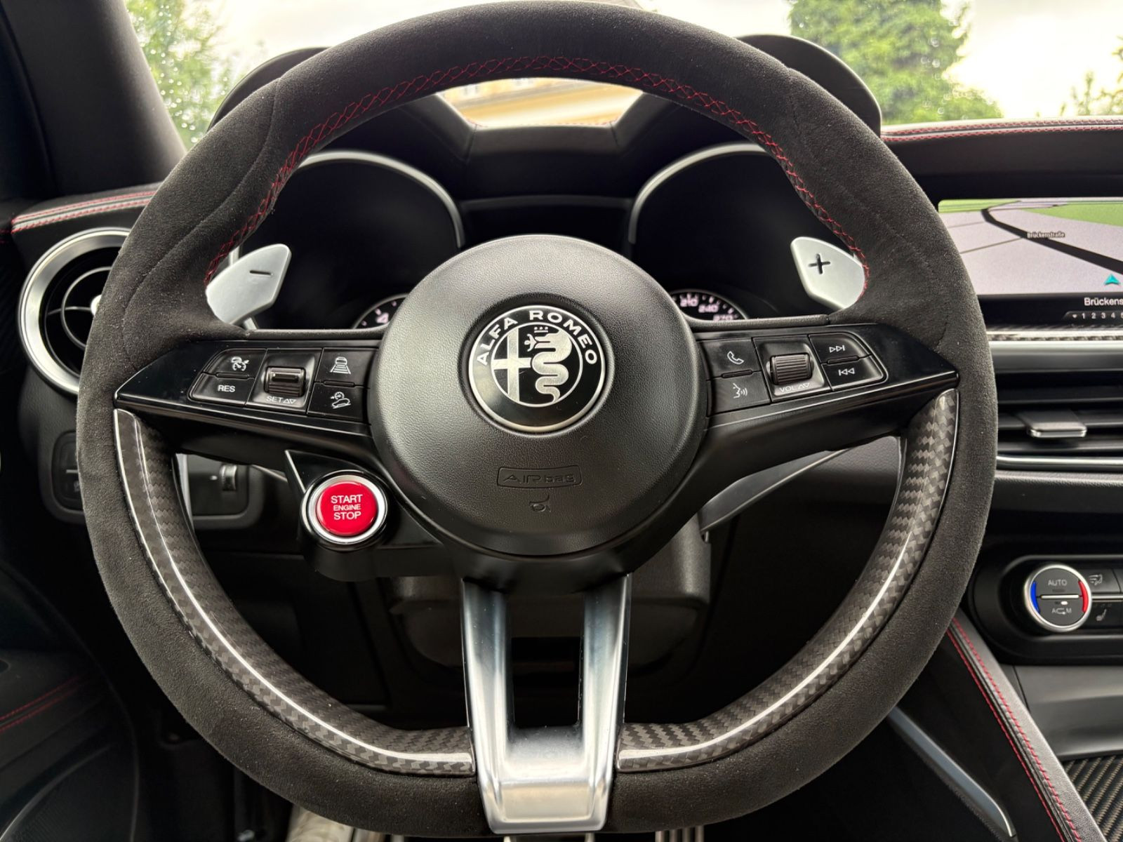 Bremssättel Rot lackiert, Gepäcknetz im Koffer-/Laderaum, Lenkrad (Sport / Alcantara, unten abgeflacht - Quadrifoglio), Raucher-Paket, Schienensystem im Kofferraum, Seitenscheiben hinten und Heckscheibe abgedunkelt, Sitze vorn elektr. verstellbar (8-fach), Sound-System Harman-Kardon, Sportsitze Leder / Alcantara (Armaturenbrett und Türverkleidung Nero / Nero), USB-Anschluss im Fond